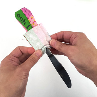 Close to the velcro end of the bracelet, pinch the fabric and pull apart (like you're opening a potato chip bag). Create a fold around the bracelet and fold it down. Place the bottom end of a butter knife (or other long narrow tool) inside the fold you just made.
